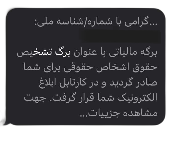 "مودی گرامی با شماره/شناسه ملی ...... برگ مالیاتی با عنوان برگ تشخیص مالیات عملکرد(یا هر مالیاتی) برای شما صادر گردید و در کارتابل ابلاغ الکترونیک شما قرار گرفت.جهت مشاهده جزئیات ......"