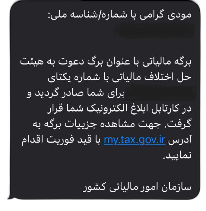 "مودی گرامی با شماره/شناسه ملی ....... برگه مالیاتی با عنوان برگ دعوت به هیات حل اختلاف مالیاتی با شماره یکتای ......... برای شما صادر گردید و در کارتابل ابلاغ الکترونیک شما قرار گرفت. جهت مشاهده جزئیات برگه به آدرس https://my.tax.gov.ir/ با قید فوریت اقدام نمایید."